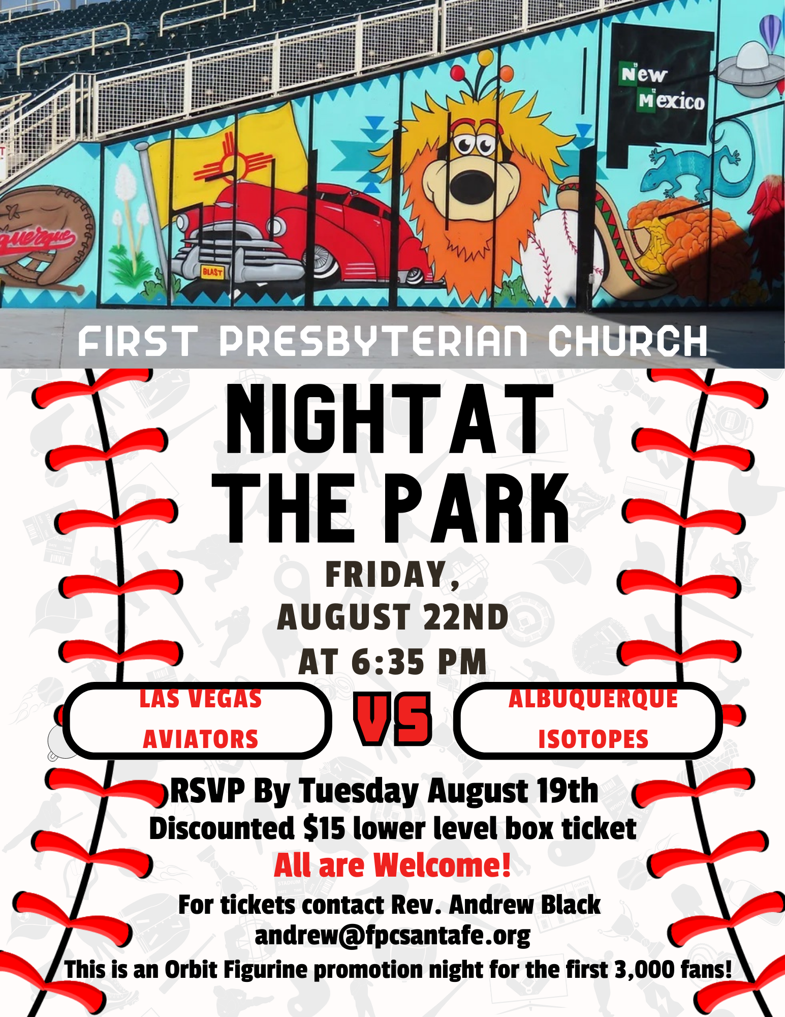 Join Family Ministry at the Isotopes Park for a fun filled evening. Albuquerque Isotopes vs. Las Vegas Aviators. There is an Orbit Figurine for the first 3,000 fans! RSVP by Tuesday Aug 19th to Andrew or Jen Black for discounted tickets. Discounted $15 lower level box tickets.